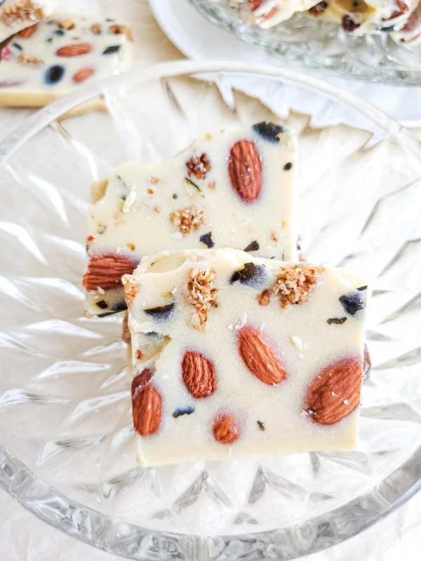 White chocolate is a favorite of mine for both gifting and eating. It’s perfect anytime and especially during the holidays seasons. Adding almond and trail mix makes this almond bark even more irresistible. Vegan white chocolate bark is a wonderful way to treat yourself and share the deliciousness and variety of vegan chocolate. Give it a try and enjoy!