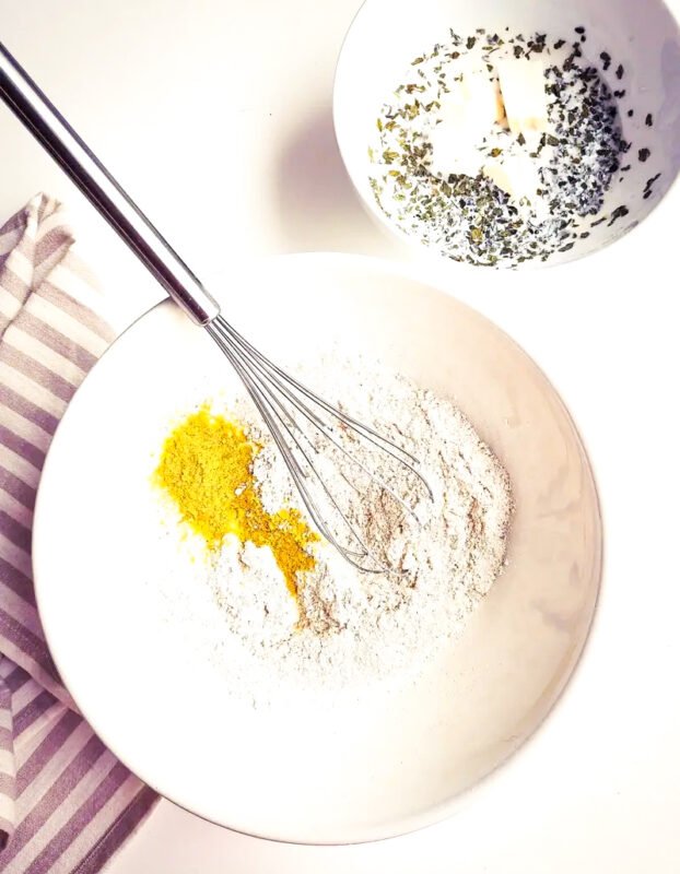 - Making Dumplings: In a medium size mixing bowl, whisk together flour, baking powder, seasoning, and nutritional yeast.