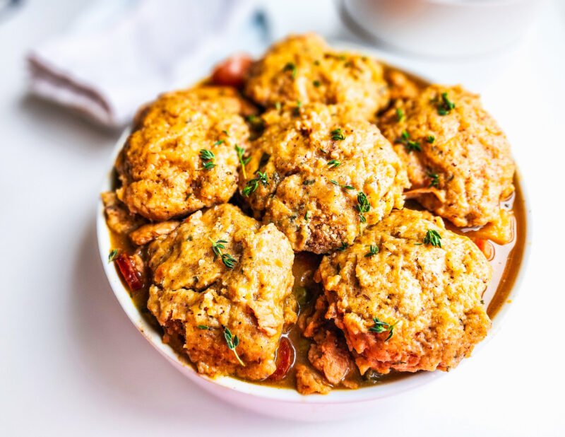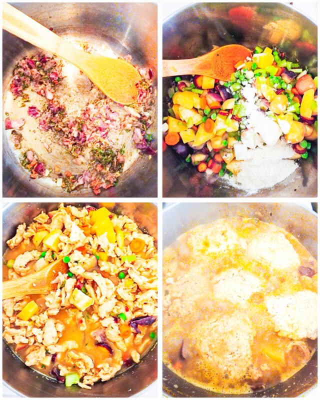 Begin by rehydrating the soy curls in water with some dehydrated vegetable mix and salt free seasoning to flavour. Let them rehydrate overnight or for at least two hours to fully form. Next, wash, prepare and chop the vegetables, and set them aside. After prepping your vegetables, make your dumplings by combining the flour, nutritional yeast, baking powder, seasoning, milk, butter, parsley and flax egg. Form dough into a soft, moist, loose ball. Cover and let sit while you make the rest of the stew.