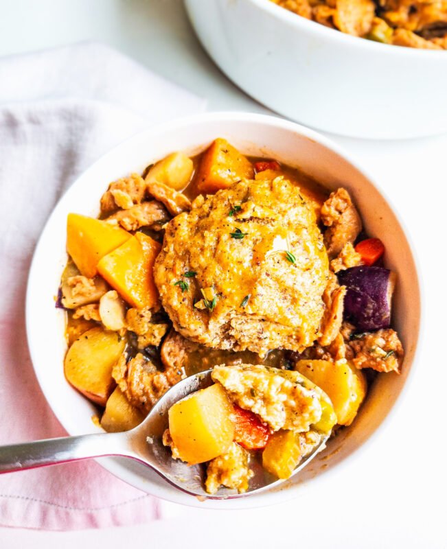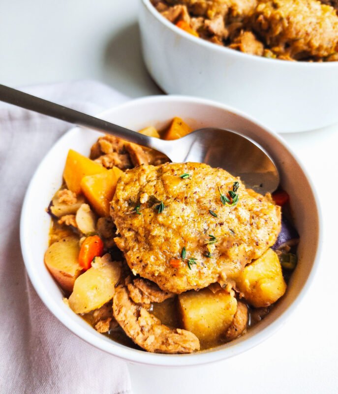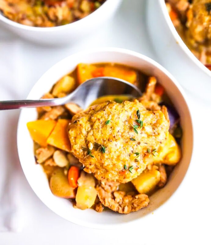 Stay warm and cosy this winter with Soy Curl Stew with Dumplings. This super easy to make vegan stew is full of colourful root veggie, chik’n pieces and topped with delicious, fluffy dumplings. It’s the perfect meal for cold winter days.