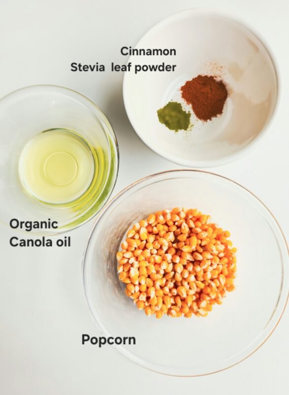 - Measure out the popcorn, organic oil, cinnamon and stevia leaf powder. Set aside.