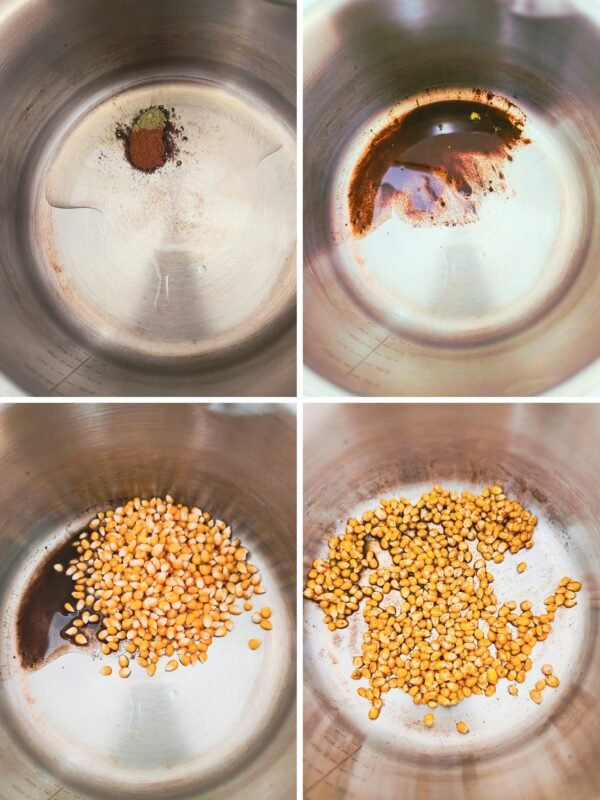 - Add the popcorn to the pot. Swirl once or twice to ensure that all the popcorn is covered by the oil and cinnamon mixture. Put the lid on the pot. Let the pot sit until you hear the first kernel pop.