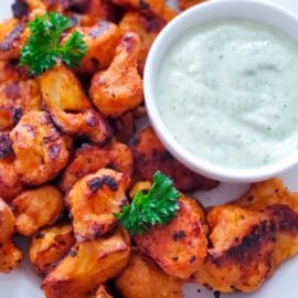 When cauliflower is done, remove and serve immediately with garlic dipping sauce.